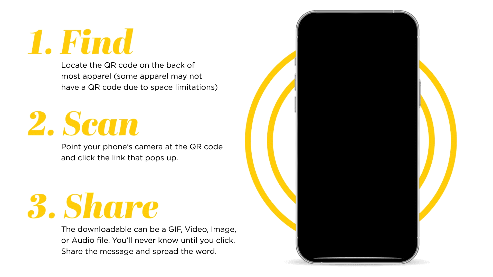 Our designs have a deeper meaning and to see a glimpse of that meaning we use Phygitals (Physical products + Digital Experience) in the form of QR codes. Once scanned and clicked you will be able to unlock a shareable downloadable which may be in the form of a Video, GIF, Image or Audio. Our hope is that you learn a little bit more about the significance of the design and continue to spread the message.